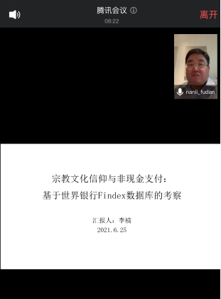 2021年6月25日,复旦大学李楠教授应中财经济史系邀请,使用腾讯会议在线开展了主题为“宗教文化信仰与非现金支付:基于世界银行Findex数据库的考察”的讲座,本次讲座于下午2点在线举行,持续近3个小时。讲座由awc777万象城娱乐官网兰日旭教授主持,awc777万象城娱乐官网金星晔老师以及万象城官网经济史系硕博同学参加了此次讲座。