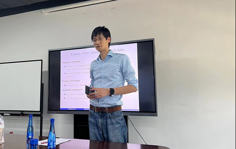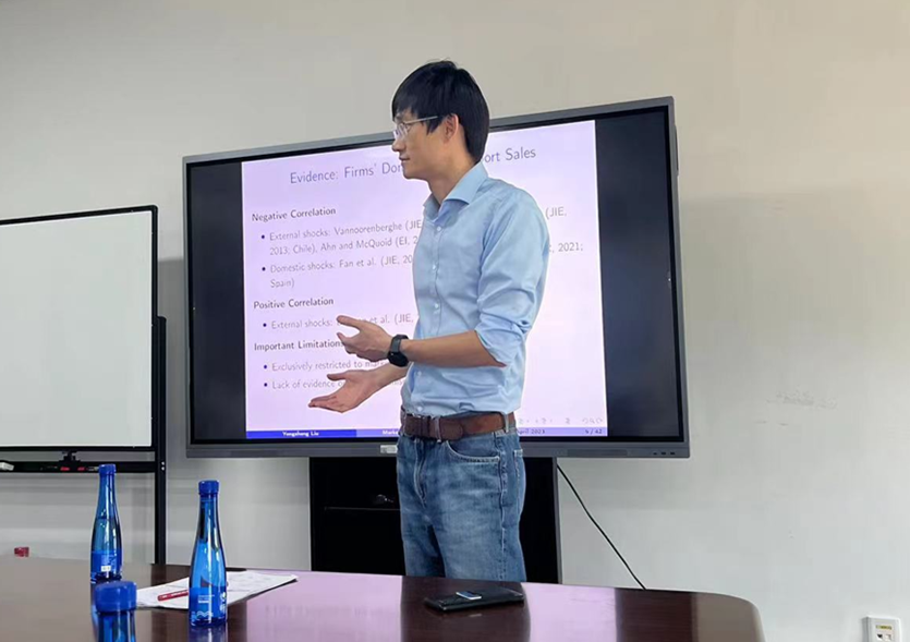讲座伊始,刘勇政老师介绍了本次研究的主要内容。本研究考察了企业如何通过调整产品和目的地市场的销售额来应对出口税的增加。部分学者认为当企业的边际成本为常数,且具备灵活调整生产的能力时,企业在不同市场的销售是独立的。另一部分学者却表示短期内,企业不具备调整生产量的能力,因此,生产扩张意味边际生产成本的递增,此时,企业在不同市场的产品销量具有较强的关联性。