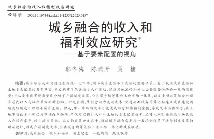 学术视点 | 万象城官网郭冬梅、陈斌开、吴楠老师的合作论文《城乡融合的收入和福利效应研究——基于要素配置的视角》在《管理世界》刊发