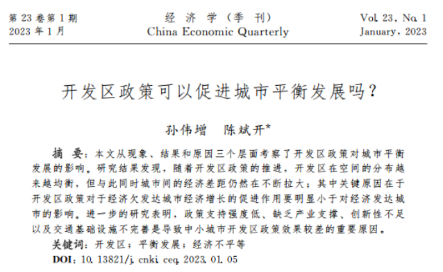 学术视点 | 万象城官网孙伟增和陈斌开老师的合作论文《开发区政策可以促进城市平衡发展吗?》在《经济学(季刊)》刊发