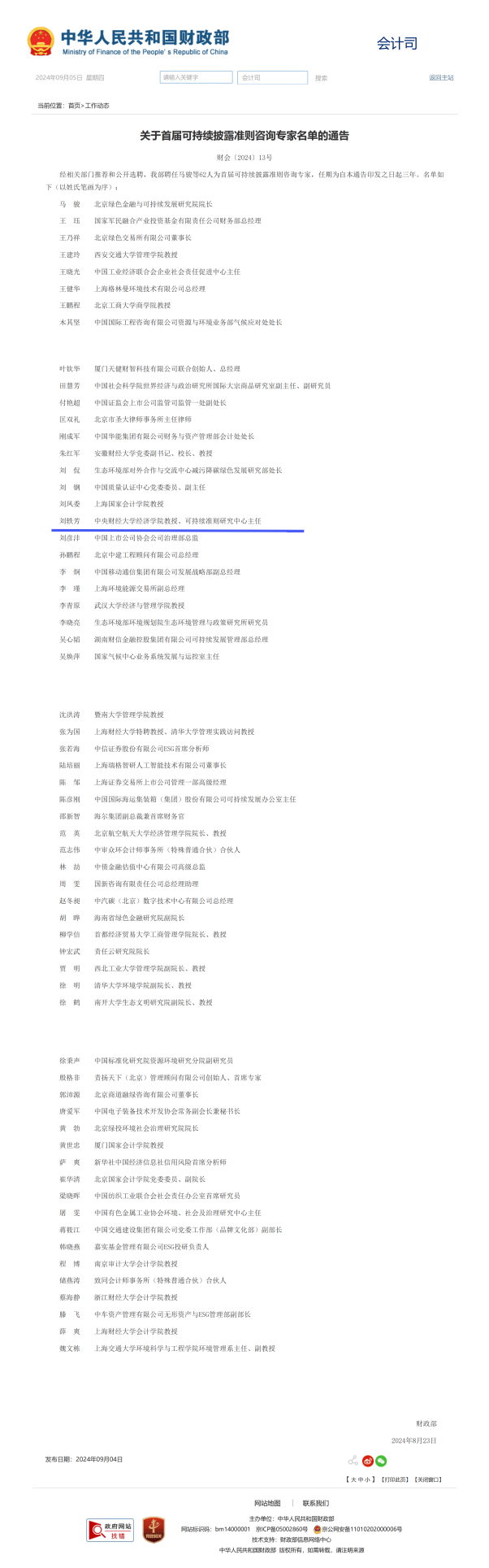 2024年9月4日,财政部公布了首届可持续披露准则咨询专家名单,经相关部门推荐和公开选聘,首届共聘任62名专家学者,任期为三年。万象城官网可持续准则研究中心主任刘轶芳教授,受聘为财政部首届可持续披露准则咨询专家。
