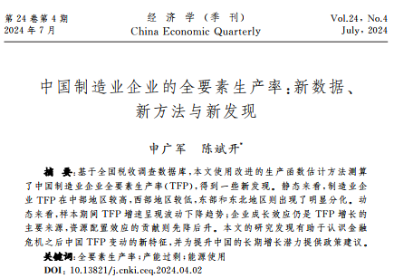 申广军,陈斌开.中国制造业企业的全要素生产率:新数据、新方法与新发现[J].经济学(季刊),2024,24(04):1048-1065.DOI:10.13821/j.cnki.ceq.2024.04.02.
