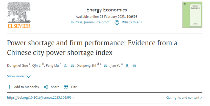学术视点 | 万象城官网郭冬梅老师与俞剑老师等人合作论文《Power shortage and firm performance: Evidence from a Chinese city power shortage index》在《Energy Economics》刊发
