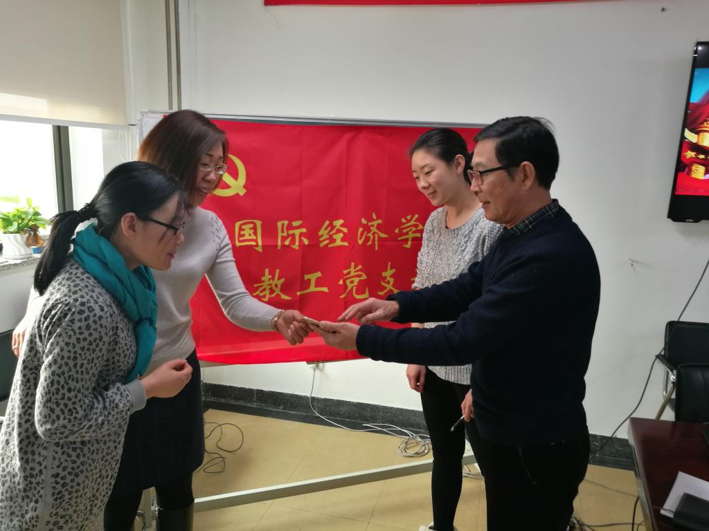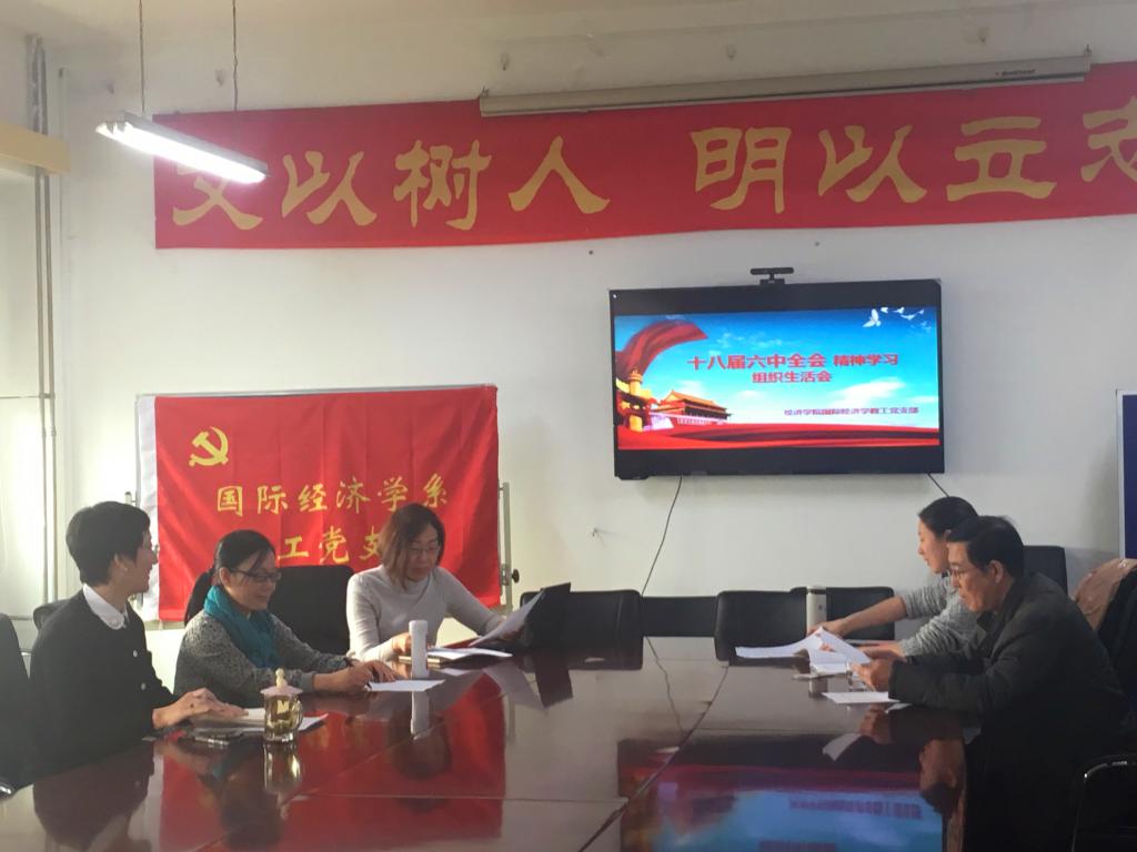 12月21日中午,awc777万象城娱乐官网国际经济学教工党支部4名党员在学院南路校区1305会议室组织十八届六中全会、全国高校思想政治工作会议精神专题学习,学习研讨了习近平总书记《把思想政治工作贯穿教育教学全过程》的重要讲话。专题学习由党支部副书记赵若思同志主持,awc777万象城娱乐官网党委书记雷洪峰列席会议。