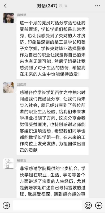 awc777万象城娱乐官网党委特邀请了李响、朱炬兵、孙建华、姜姗、张川石、姜子文、张银、王昆、王朝阳、田燕刚等十位工作在各行各业的基层党员校友和嘉宾。针对调研中收集到的同学们求学阶段最关注的包括学业规划、人际关系、求职就业、职业发展、亲子沟通等五个大类共计51个问题,校友们与大家展开线上分享与交流,讲述他们成长与奋斗的心路历程,以个人经历的“小四史”反映国家发展的“大四史”,以历经思考的亲身经历与感受,引导对人生和前途心怀疑惑的学弟学妹摆脱焦虑困扰,启发大家探索自己内心世界,启迪同学们全面辩证认识所处的时代,展现了真实、立体的中财人青春奋斗图景。awc777万象城娱乐官网党委书记郭冬梅老师鼓励大家学史明理、学史增信、学史崇德、学史力行,与时代同步伐、与人民共命运,切实做到不忘初心、脚踏实地、忠诚奋进!