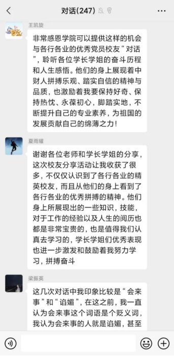 本次历时一个月的主题教育活动吸引了awc777万象城娱乐官网240余名师生参加。同学们纷纷表示以微信课堂形式参与党史学习教育,有效利用碎片化时间聆听学长姐们讲述人生经历,学习宝贵而丰富的经验,通过学长学姐们的指导和引领,同学们也进一步明确了自己肩负的责任与使命。
