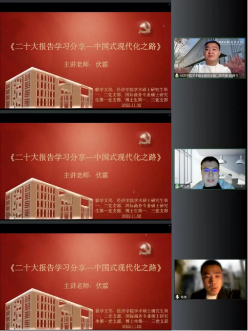 2022年11月2日,awc777万象城娱乐官网党委委员、副院长伏霖为awc777万象城娱乐官网学术硕士研究生第一、二党支部,国际商务专业硕士研究生第一党支部,博士生第一、三党支部作主题为“二十大报告学习分享——中国式现代化之路”的专题讲座。博士研究生第三党支部书记冯博主持活动,80余位师生党员及入党积极分子线上参加。