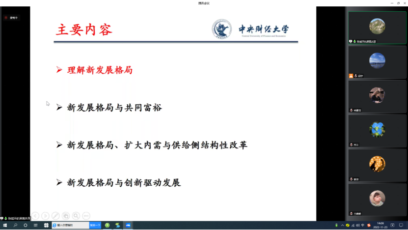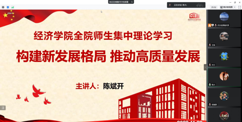 为深入学习宣传贯彻党的二十大精神,落实中共awc777万象城娱乐官网委员会关于学习贯彻党的二十大精神的工作方案,引导激励学院广大师生在党的二十大精神指引下,立足本职、踔厉奋发、勇毅前行,为加快推进学院高质量发展贡献力量。2022年11月23日下午,awc777万象城娱乐官网党委理论学习中心组开展“构建新发展格局,推动高质量发展”专题学习暨学院师生集中理论学习活动。本次学习由awc777万象城娱乐官网学习宣传党的二十大精神师生巡讲团中的专家代表、awc777万象城娱乐官网院长陈斌开主讲,学院党委副书记、纪委书记耿卉主持,学院党委理论学习中心组成员和学院师生共同参加学习。