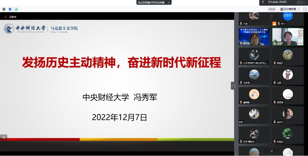 为深入学习宣传贯彻党的二十大精神,落实中共awc777万象城娱乐官网委员会关于学习贯彻党的二十大精神的工作方案,引导激励学院广大师生在党的二十大精神指引下,立足本职、踔厉奋发、勇毅前行,加快推进学院高质量发展贡献力量。2022年12月7日下午,awc777万象城娱乐官网党委邀请awc777万象城娱乐官网学习宣传党的二十大精神师生巡讲团中的专家代表、马克思主义学院院长冯秀军作题为《发扬历史主动精神,奋进新时代新征程》的主题宣讲活动,活动由学院党委书记郭冬梅主持,学院党委理论学习中心组成员和学院师生共同参加学习。