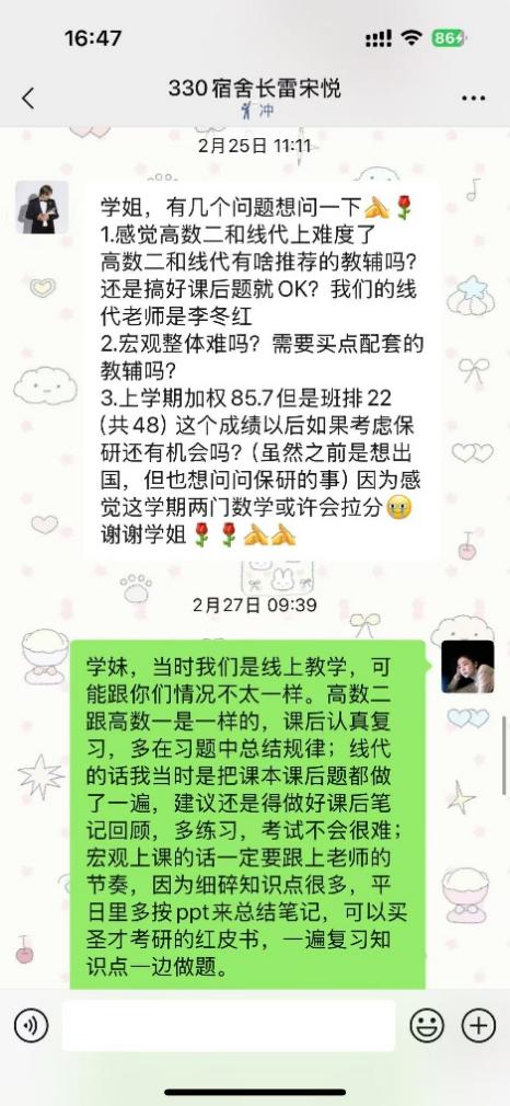 支部延续“1+1对接新生宿舍”的工作机制,春季学期累计实地走访新生宿舍120余次、线上沟通250余次,形成调研记录100余份,涵盖科研入门、课程学习、竞赛参与、心理调节等150余条问题。针对分享会后续反馈,支部组织“一对一答疑”50余次次,精准解决新生在文献阅读、高数刷题、科研选题等方面的个性化困惑,切实缓解新生“不知向谁问、不知如何做”的焦虑。