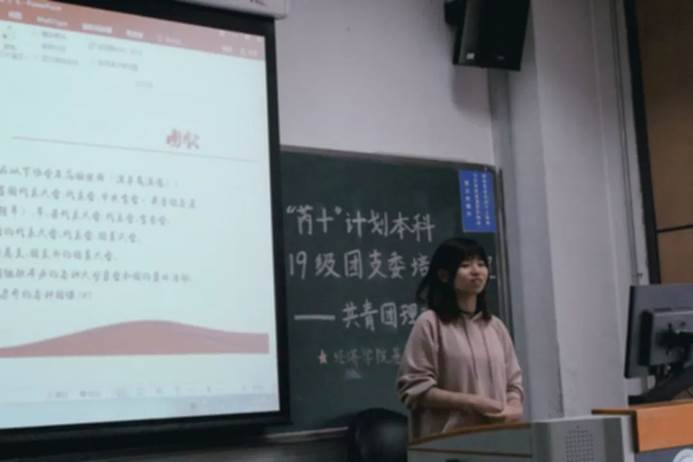 接下来,由于飞对团支委进行共青团理论培训。在讲课正式开始前,她用一段“入团第一课”的视频带领着团员们回顾了从1919年先进青年的五四运动到1922年中国共青团正式成立直至今日的辉煌所走过的光荣历程。同时,短片中对近年来中国共青团开展的线上线下系列活动进行了总结,让团员们对团史团情有了更深层次的了解。紧接着,于飞向团员们详细讲解了团徽团旗的组成及其象征意义,并带领各位团员认真学习各项团的章程。而后,她对万象城官网共青团重点工程——青年马克思主义者培养工程以及基础团校进行了详细介绍,并鼓励同学们积极参加。最后,于飞对“芮+”计划进行了整体系统的讲解,让各团支委对万象城官网“芮+”计划有了进一步的了解。