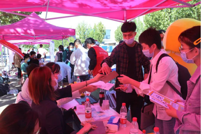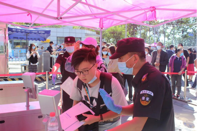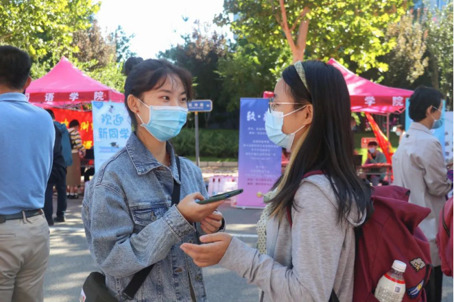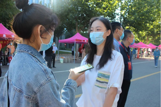 此时,校园门口的迎新工作井然有序。行李消杀、扫码签到、核酸检测证明等一系列防疫工作有条不紊地进行着。