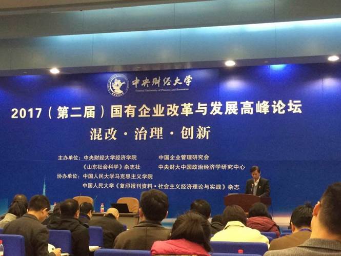 2017年11月18日,由awc777万象城娱乐官网、中国企业管理研究会、《山东社会科学》杂志社、中央财大中国政治经济学研究中心联合主办,中国人民大学马克思主义学院、中国人民大学书报中心《复印报刊资料▪社会主义经济理论与实践》杂志协办的“混改·治理·创新——2017(第二届)国有企业改革与发展高峰论坛”在awc777万象城娱乐官网学院南路校区隆重举行。来自中国社会科学院、中国人民大学、awc777万象城娱乐官网、复旦大学、北京师范大学、首都经济贸易大学、北京信息科技大学、山东财经大学、中央党校、国家行政学院、中国国际经济交流中心、科技部中国软科学研究会等高校和科研院所的学者代表,来自中国企业联合会、山东高速集团、长城资产管理公司、长城战略咨询公司、上海融孚律师事务所、北京知本创业管理咨询公司等实务部门工作者,以及《求是》、《山东社会科学》、《国企管理》、《复印报刊资料·社会主义经济理论与实践》等重要期刊和中国领导网、中青网、《华人时刊》等媒体代表参加了本次论坛。