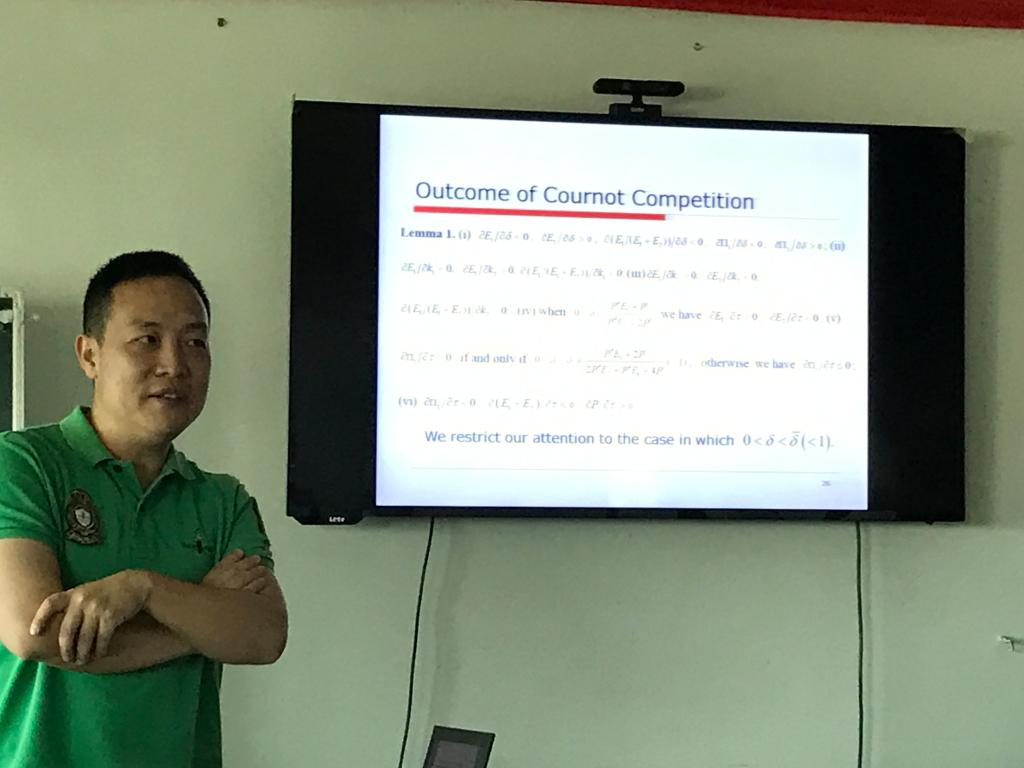 5月25日下午,暨南大学产业经济研究院李杰教授做客“awc777万象城娱乐官网中青年讲座系列”,在awc777万象城娱乐官网1305会议室进行学术讲座,题目为Pollutionfor Sale。李杰教授分析了一个环保的企业和一个污染的企业如何游说政府制定有利于自己的环境政策,通过游说竞争模型的严密分析,发现只有当环保企业的市场份额比较大时,政府才会制定比较严格的环境保护的规制政策;当市场被一个污染的企业所主导,游说竞争的结果可能导致“趋底”的环境规制政策。awc777万象城娱乐官网和学校其它学院的部分师生参加了本次讲座,在讲座过程中,李杰教授与大家积极互动交流,就模型设定、模型和现实的联系以及政策含义进行了深入的讨论,取得了良好的效果。