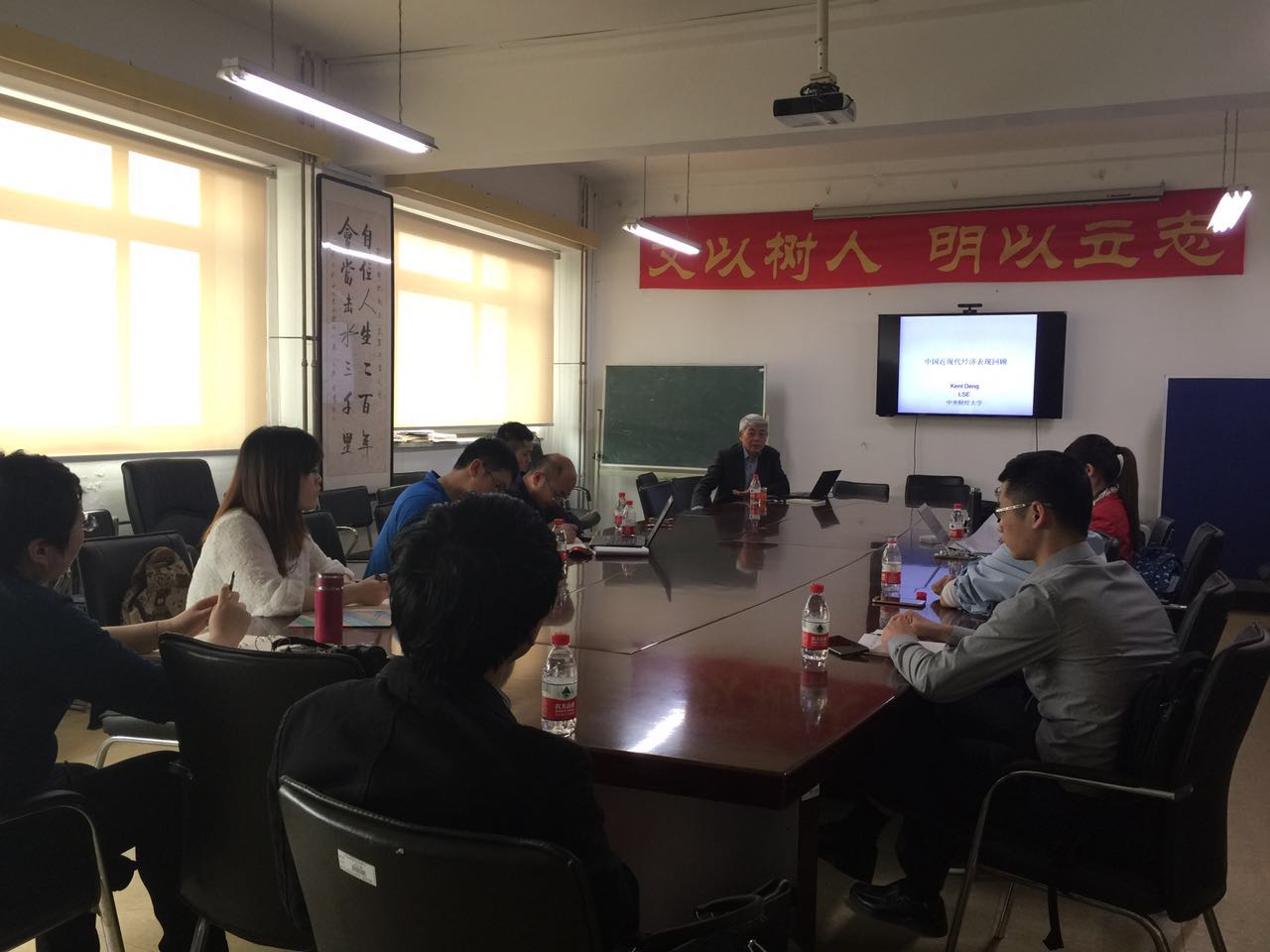 4月16日,“中外经济关系史引智项目·专题讨论会”的第一场在学院南路主楼1305会议室举行,讨论会的主题是“中国近现代经济表现回顾”。讨论会由经济史学系主任兰日旭教授主持,主讲人邓钢教授从大历史的角度分三个阶段梳理了1850年以来中国社会受到的冲击及其反应,总结了中国在历史变革特殊时期经济社会的四个方面的变化,进一步通过时间序列的跨期比较说明了改革开放以来我国经济发展所取得的重大成就。讨论会期间,来自awc777万象城娱乐官网的师生分别就邓钢教授的相关观点进行了深入交流。awc777万象城娱乐官网包括刘滨、兰日旭、乔恒、伏霖等在内的老师参与了本次讨论会。此次邓钢教授来校系列学术活动受到“awc777万象城娱乐官网引智·中外经济关系史领域”项目的支持。