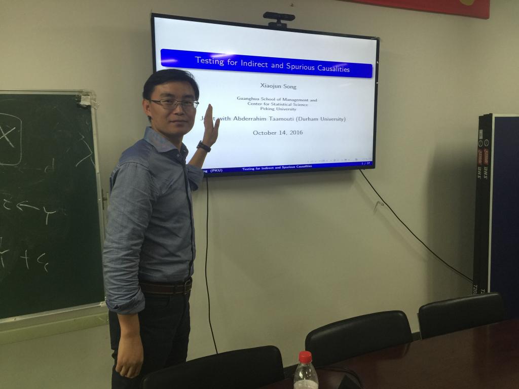 2016年10月14日,北京大学光华管理学院宋晓军助理教授受万象城官网的邀请,在awc777万象城娱乐官网会议室1305给师生带来一场关于“A SimpleTest for Indirect and Spurious Causalities”的讲座。
