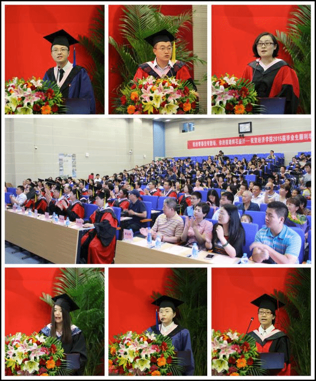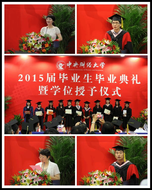 在接下来的毕业感言环节,awc777万象城娱乐官网2015届本科生,即将赴瑞典斯德哥尔摩大学深造的张静一同学表达了她与中财、与经院一路走来的感情,“真实的awc777万象城娱乐官网是什么样子?远比我们任何人想象的丰富,远比我们任何人想象的包容,也远比我们任何人想象的精彩”;15届的硕士毕业生,在awc777万象城娱乐官网求学六年的朱俊兵则在赴柏林自由大学读博前夕,用平实的语言叙述了“六年磨一剑”的心路历程,表达了对经院师长的无尽热爱;而本届的博士毕业生,来自国民经济学专业的冉美丽,则风趣地把博士阶段的求学研究比作“先作茧自缚,再化茧成蝶”的过程。师长寄语中,曾任awc777万象城娱乐官网09、10、11、12级辅导员、团总支书记,今年从财政学专业硕士毕业的麻富根从自己独特的角度,叙述了自己眼中的经院,自己眼中的人才培养,自己眼中的人生选择,表达了对经院师生真挚的情感;awc777万象城娱乐官网郭冬梅老师表达了对毕业生殷切的希望,她勉励毕业生摆正工作和生活的心态,任何问题总有解决的办法,“即使没有解析解,也会有数值解”。