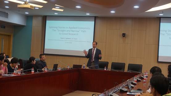 2018年10月12日上午10:00-12:00,加州大学戴维斯分校农业与资源经济系Travis J.Lybbert教授应awc777万象城娱乐官网邀请,在学术会堂604会议室开展了主题为“Spinning Stories in Applied Economics: The “Straight and Narrow”Path to Good Research”的讲座,该讲座是awc777万象城娱乐官网劳动经济学与发展经济学讲座系列2018年秋季学期第一讲。讲座由awc777万象城娱乐官网张舰教授主持,多名awc777万象城娱乐官网教师以及awc777万象城娱乐官网30余名博士和硕士生参加了本次讲座。