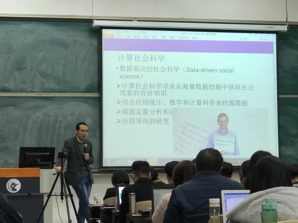 2018年11月9号下午6:30,awc777万象城娱乐官网计算社会科学系列课程正式开始。课程第一讲由清华大学社会科学学院政治学系副教授孟天广老师于主教213主讲。此次课程主题为社科研究中的大数据方法,期间孟天广教授从大数据+社会科学、计算社会科学方法论、研究方法、研究议题以及大数据方法的支持和批评等五个板块出发,为我们系统介绍了当前计算社会科学的发展趋势和前沿研究。