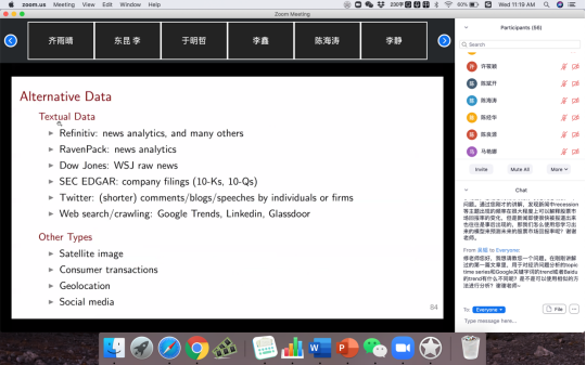 2020年6月3,10日,芝加哥大学布斯商学院教授修大成应邀参加由awc777万象城娱乐官网、北京工商大学awc777万象城娱乐官网和awc777万象城娱乐官网互联网经济研究院联合主办的“海外学者前沿短期课程”,通过线上连线,为师生讲授“金融经济学中的机器学习方法”专题研究。课程由awc777万象城娱乐官网黄乃静副教授主持,百余名师生以及来自香港中文大学,复旦大学,中国人民大学、浙江大学、北京工商大学、中山大学的专家和学者参加了课程。