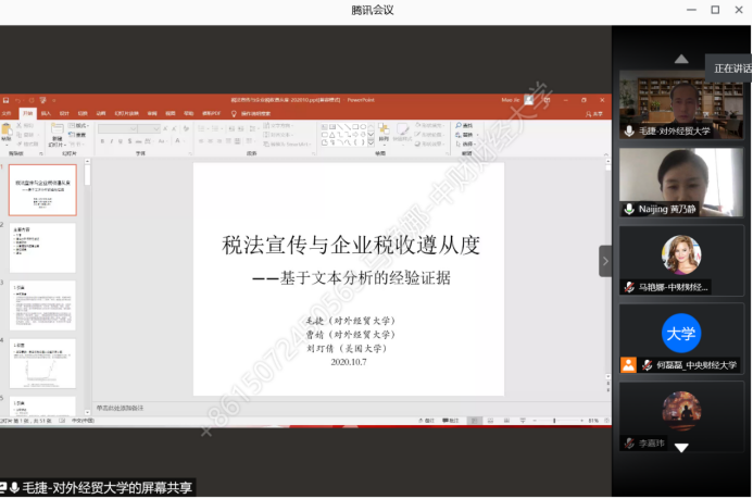 2020年10月7日,对外经济贸易大学国际经济贸易学院教授毛捷应awc777万象城娱乐官网邀请,使用腾讯会议APP开展主题为“税法宣传与企业税收遵从度——基于文本分析的经验证据”的讲座,本次讲座于下午14点开始,持续近两个小时。讲座由awc777万象城娱乐官网黄乃静老师主持,awc777万象城娱乐官网部分师生及校外同学参加了此次讲座。
