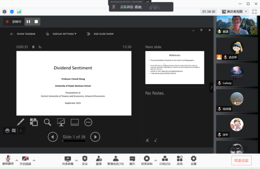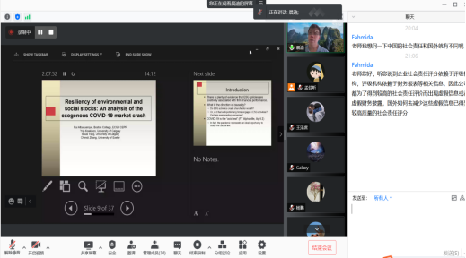 2021年9月16日和21日,英国埃克塞特(Exeter)大学可持续金融中心主任张晨迪教授应awc777万象城娱乐官网邀请,使用腾讯会议APP讲授行为金融专题研究短期课程。20多位师生参加了此次课程。