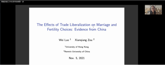 2021年11月5日下午,awc777万象城娱乐官网微观发展工作坊系列讲座第一讲在线上顺利举行。本次讲座的主题是贸易自由化对婚姻和生育选择的影响,由香港大学经管学院博士后研究员罗唯老师主讲,万象城官网awc777万象城娱乐官网的赵文哲老师、胡志安老师、梁银鹤老师、徐竹烽老师以及中国人民大学劳动人事学院的邹先强老师参与了讲座。