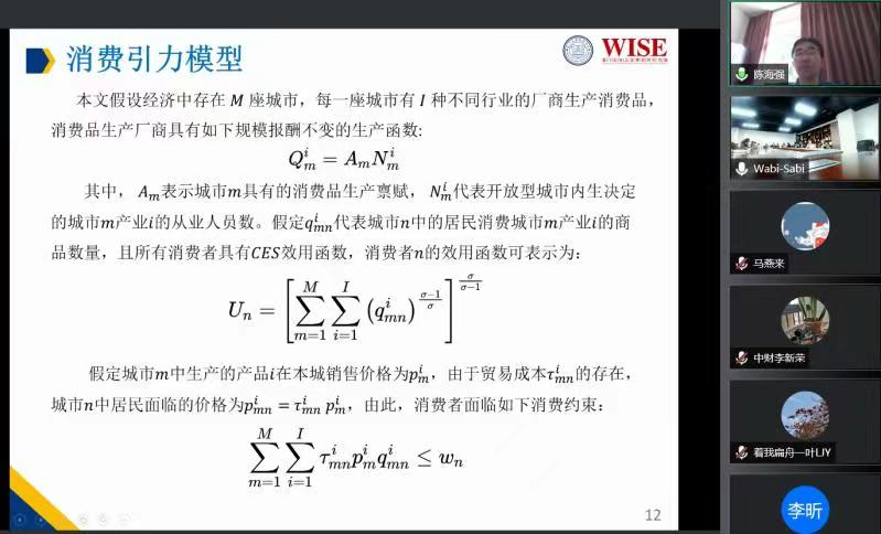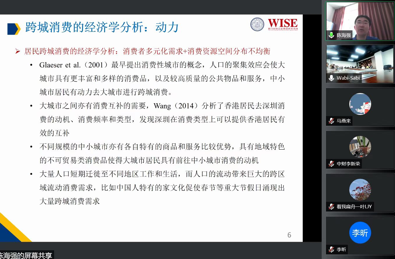 2021年11月19日,厦门大学王亚南经济研究院副院长、awc777万象城娱乐官网金融系与邹至庄经济研究中心陈海强教授应awc777万象城娱乐官网邀请,开展主题为“中国城镇居民跨城消费的空间分布及影响因素—兼论消费流动的空间整合基础”的讲座,本次讲座于下午2点通过腾讯会议平台线上线下举行,共持续两小时。本次讲座由awc777万象城娱乐官网黄乃静副教授主持,awc777万象城娱乐官网郭冬梅教授,李新荣副教授等师生参加了此次讲座。