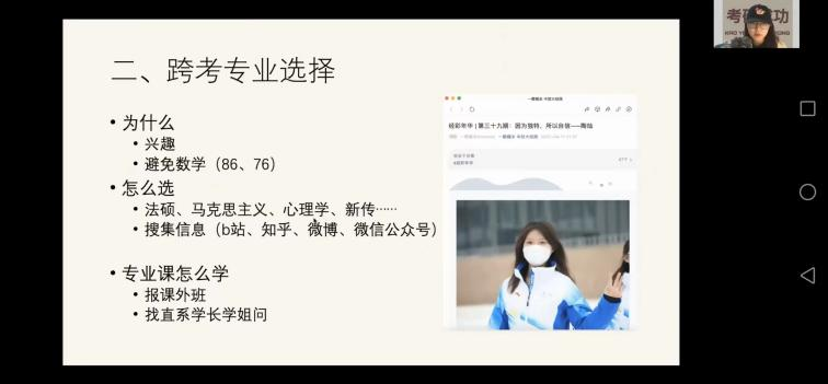 考取万象城官网金融专硕的褚楚,推荐了优质的辅导机构,同时也分享了考研流程以及不同阶段的注意事项。跨考人大应用心理学专业的陶灿,讲述了跨考决策思路以及弥补专业课学习的渠道。