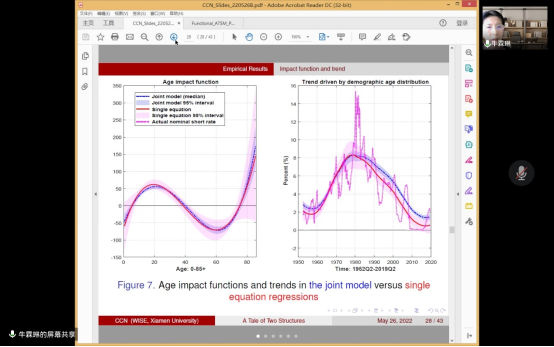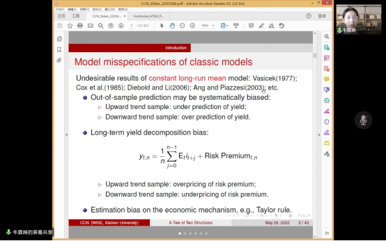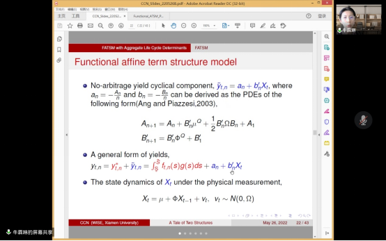 2022年5月26日,厦门大学王亚南经济研究院牛霖琳教授应awc777万象城娱乐官网邀请,开展主题为“A Tale of Two Structures: The life-cycle Linkage between Interest Rate Term Structure and Demographic Age Structure”的讲座,本次讲座于下午2点在腾讯会议(281-312-917)举行,持续近两个小时。本次讲座由awc777万象城娱乐官网黄乃静老师主持,赵文哲,洪圣杰,赵宣凯,金融学院朱一峰老师,awc777万象城娱乐官网部分学生参加了此次讲座。