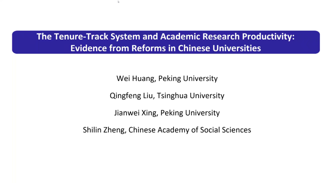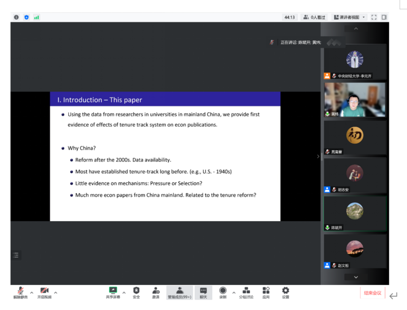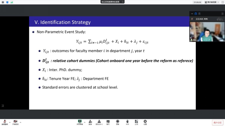 黄炜副教授提出终身教职是学术机构激励其研究人员的常用制度。这个制度是否有效地促进学术产出?为了回答这个问题,黄炜副教授搜集了中国46个经济系的人事制度改革以及每位教员的个人信息。通过各院系之间的终身教职改革错开时间的变化,黄炜副教授使用事件研究框架来估计终身教职制度对研究生产率的影响,并定量估计这种制度变化对经济学期刊论文发表量增长的贡献程度。