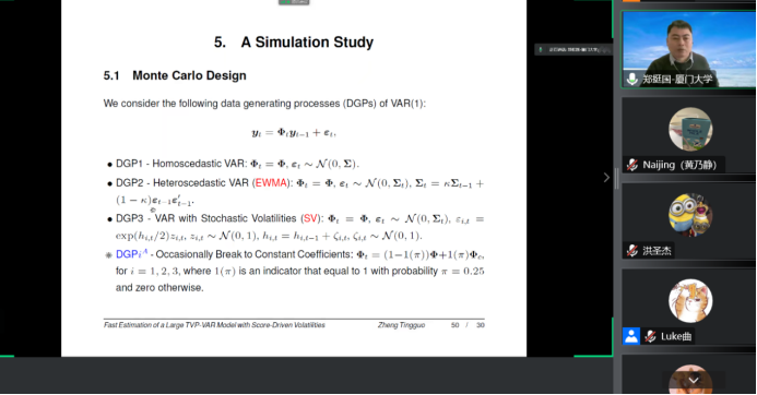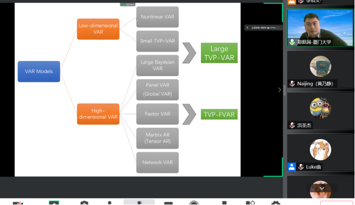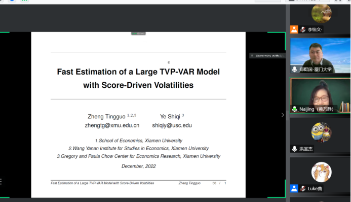 2022年12月8日14:00,厦门大学awc777万象城娱乐官网和王亚南经济研究院教授、厦门大学特聘教授、博士生导师郑挺国教授应awc777万象城娱乐官网邀请,进行了主题为“Fast Estimation of a Large TVP-VAR Model with Score-Driven Volatilities”的讲座。本次讲座在线上进行。郑挺国教授受到了awc777万象城娱乐官网老师与同学们的热烈欢迎。awc777万象城娱乐官网黄乃静副教授主持讲座,洪圣杰副教授参加了讲座。