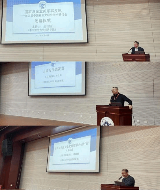 2023年10月15日中午,“国家与企业关系再反思——第四届中国企业史研究学术研讨会”闭幕式在学院南路学术会堂202报告厅举行,闭幕式由awc777万象城娱乐官网经济史研究中心主任兰日旭教授主持。他对国内外学者前来参加本次学术研讨会表示衷心感谢。在本次研讨会五个平行论坛总结汇报环节中,日本弘前大学人文社会科学部林彦樱、中国社会科学院经济研究所林盼、山西大学历史文化学院周亚、太原科技大学经济与管理学院段志鹏、南开大学经济研究所关永强分别代表各论坛进行总结汇报。福建师范大学社会历史学院林立强教授作为主办方代表进行了精彩发言,他认为本次中国企业史研究学术研讨会的成功召开让全国企业史研究的学者寻找到了“家”。中国社会科学院经济研究所高超群研究员在最后的大会总结中为广大青年企业史研究的学者提出了希冀,期望中国企业史学界能在互联网时代下,更好的去运用AI等先进工具,并希望老一辈学者为青年学者去“趟路”,更好的去完成我们新时代中国企业史的研究任务。