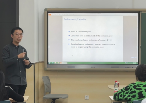 随后,胡博老师详细介绍了供应链金融计划当中模型的假设条件以及模型的设定。模型的行为主体由三部分组成:供应商、消费者以及一个中间商。每个供应商生产的产品都是独特且相互独立的;他们的边际成本不变,但供应商之间的边际成本不同,且边际成本是可观测的公共数据。消费者的体量很大,且他们对于每种商品单位需求的效用大于最高的边际成本。中间商从供应商手里买产品再卖给消费者,同时他运作着一个供应链金融项目,且他在对接每一个供应商时都存在一个固定成本。
