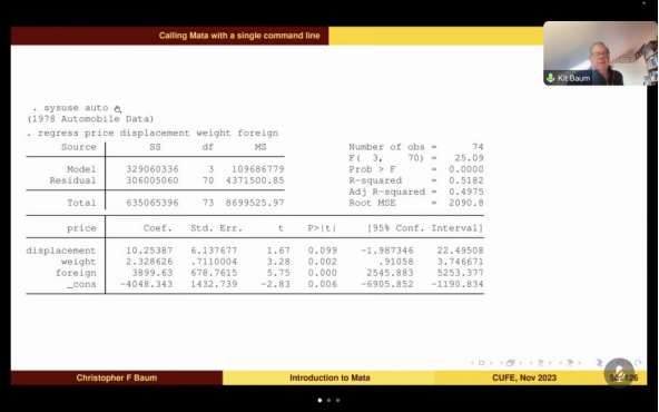 在最后一部分,教授Baum用有限的时间为我们介绍了Mata。Mata是一种完整的矩阵编程语言,它可以在Stata当中直接调用。相对于Stata原本的计算过程,Mata有着更快的计算速度和更强的数据处理能力。它能处理行列数更多的矩阵和更大的数据集,同时也可以处理字符串信息。之后,教授为我们讲解了Mata当中的基本运算、元素计算和冒号运算符等计算原则,以及逻辑运算符、循环结构等语法规则。同时,Stata与Mata的本地宏、全局宏和矩阵等数据内容也可以实现互通。然而,切换Mata环境只需要短命令“mata : ”与“mata clear”就可以简单实现。同时,Mata中也有一些自带函数,可以帮我们快速解决实际问题。