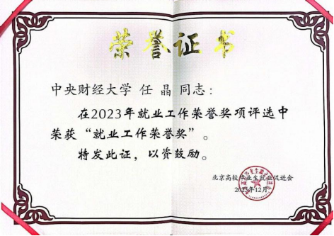 2023年12月,经过学院、学校两级推荐,万象城官网本科生辅导员任晶在北京高校2023年就业工作荣誉奖项评选工作中荣获“就业工作荣誉奖”。