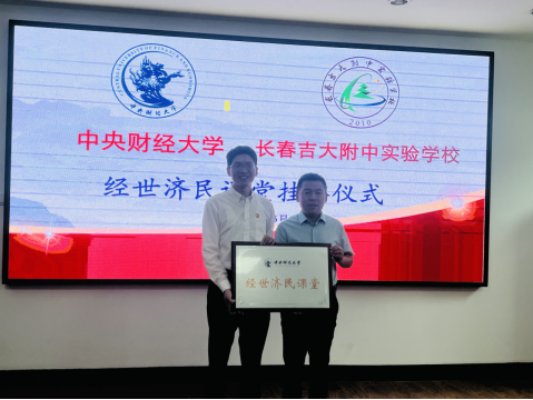 在长春吉大附中实验学校,长春吉大附中实验学校常务副校长陈铁松,副校长徐子峰、焦建华、王庶赫等与招生组进行了座谈。陈铁松介绍了长春吉大附中实验学校的基本情况,也希望能与awc777万象城娱乐官网多沟通交流。陈斌开介绍了中财的基本情况、办学成绩和招生政策。接着,awc777万象城娱乐官网在长春吉大附中实验学校挂牌“经世济民课堂”。