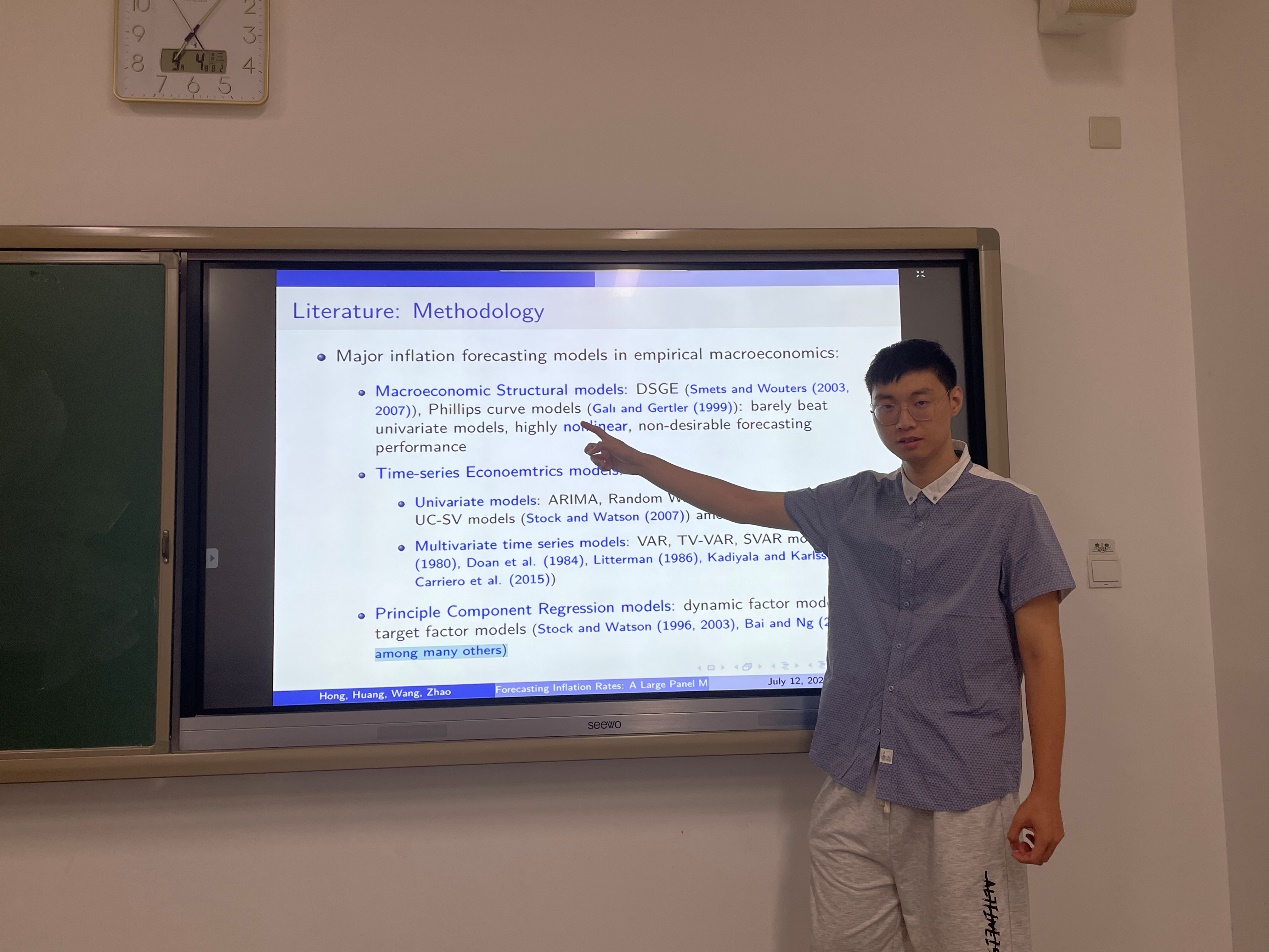 本文旨在构建一种新的通货膨胀预测计量方法,该方法利用微观股票价格作为预测变量,结合机器学习模型提取微观股票价格中包含的异质性、相互作用、非线性关系等关键信息,从而对未来通货膨胀进行预测。本文从实证的角度证明了该通货膨胀预测方法相对传统时间序列计量模型和因子模型的优势,且微观层面的股票价格相比传统的宏观预测变量有着更好的预测能力。进一步地,本文计算了企业在未来通货膨胀中的相对重要性,分析不同行业公司对通胀预测的异质性影响。此外,本文还探究了公司的不同特征(如公司规模、财务状况等)对通货膨胀预测产生的不同影响。本次汇报内容详实,逻辑严密,汇报中受到了多位老师同学的关注、指导与肯定,并收到了他们提出的建设性意见,为论文的进一步修改完善积累了宝贵的建议。