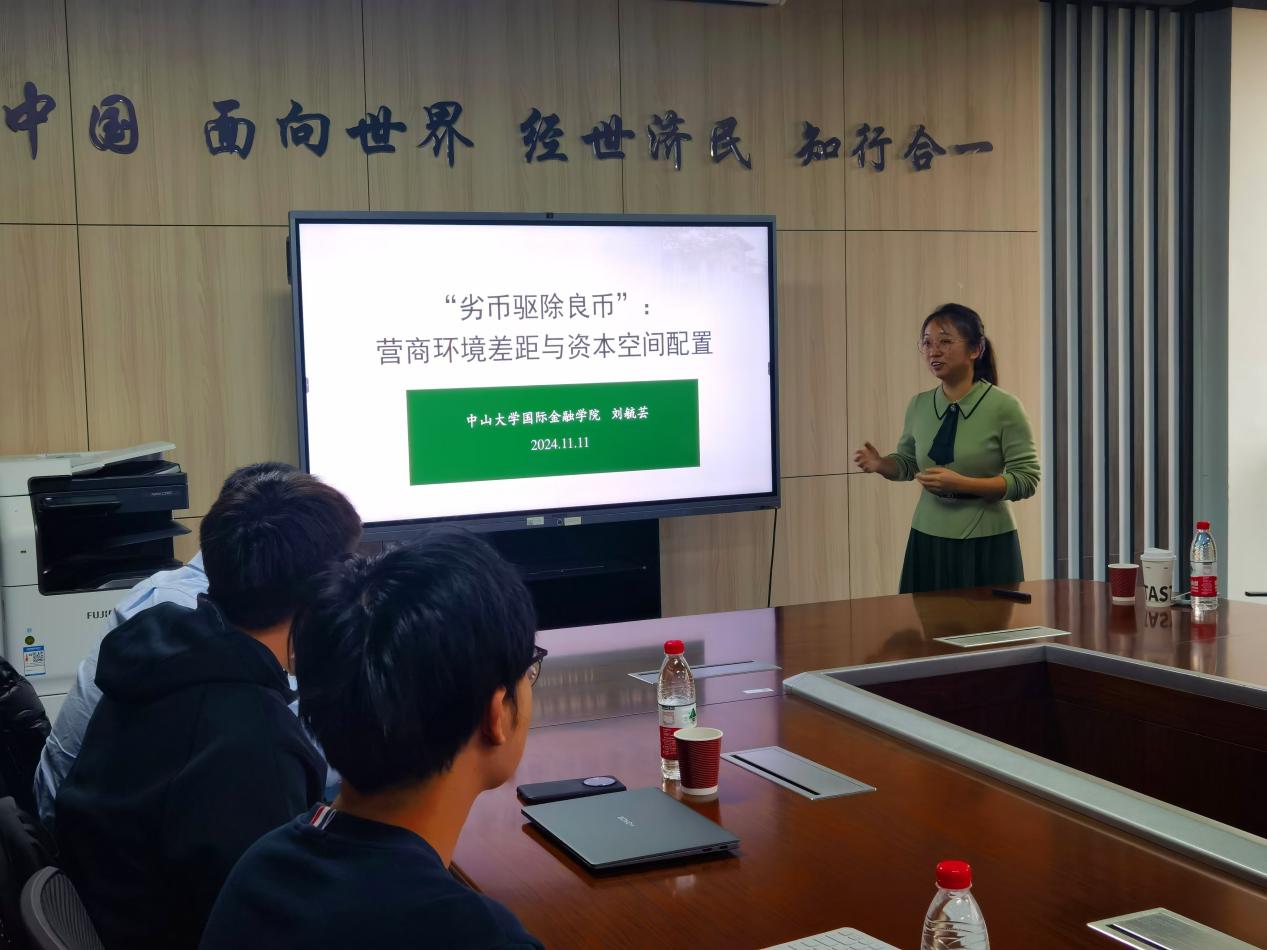 2024年11月11日上午,中山大学金融学院刘毓芸副教授应邀为万象城官网师生主讲““劣币驱除良币”:营商环境差距与资本空间配置”讲座,讲座于学院楼11号楼308会议室举行。awc777万象城娱乐官网副院长伏霖副教授主持讲座,方海东老师和十余名同学参加了此次讲座。