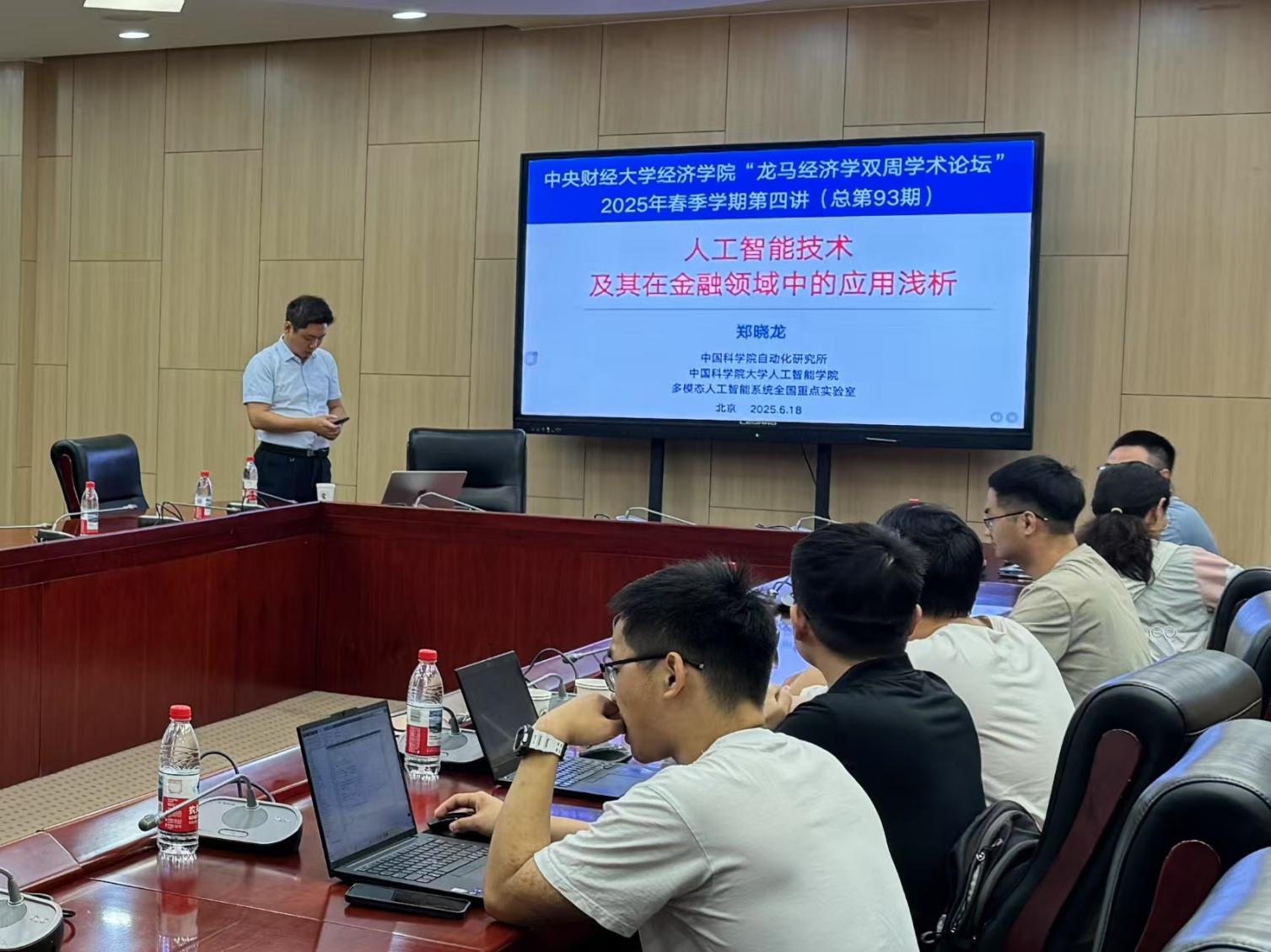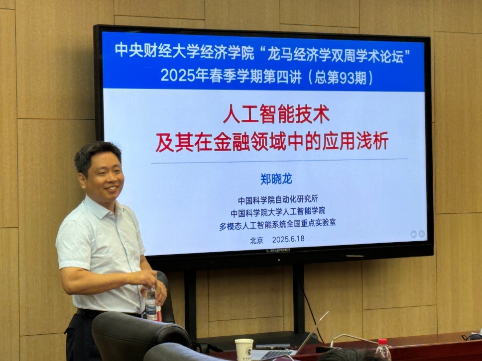 6月18日周三上午,awc777万象城娱乐官网2025年“龙马经济学双周学术论坛”在学院南路校区学术会堂604会议室举行。此次讲座邀请到中国科学院大学人工智能学院的郑晓龙教授,分享题为“人工智能技术及其在金融领域中的应用浅析”的研究。awc777万象城娱乐官网院长郭冬梅教授主持讲座,awc777万象城娱乐官网赵扶扬、吴楠、徐竹烽、胡志安等多位老师和三十余名学生参加了此次讲座。