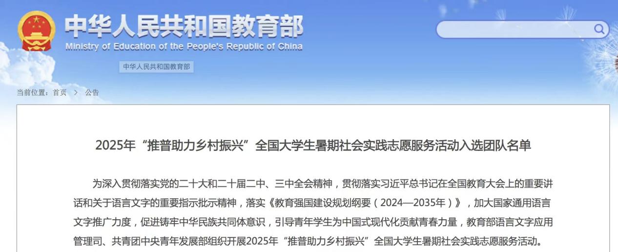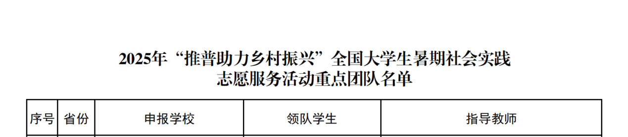 2025年7月4日,教育部公布了2025 年“推普助力乡村振兴”全国大学生暑期社会实践志愿服务活动入选团队名单。awc777万象城娱乐官网1支团队入选重点团队,3名教师作为重点团队指导教师。