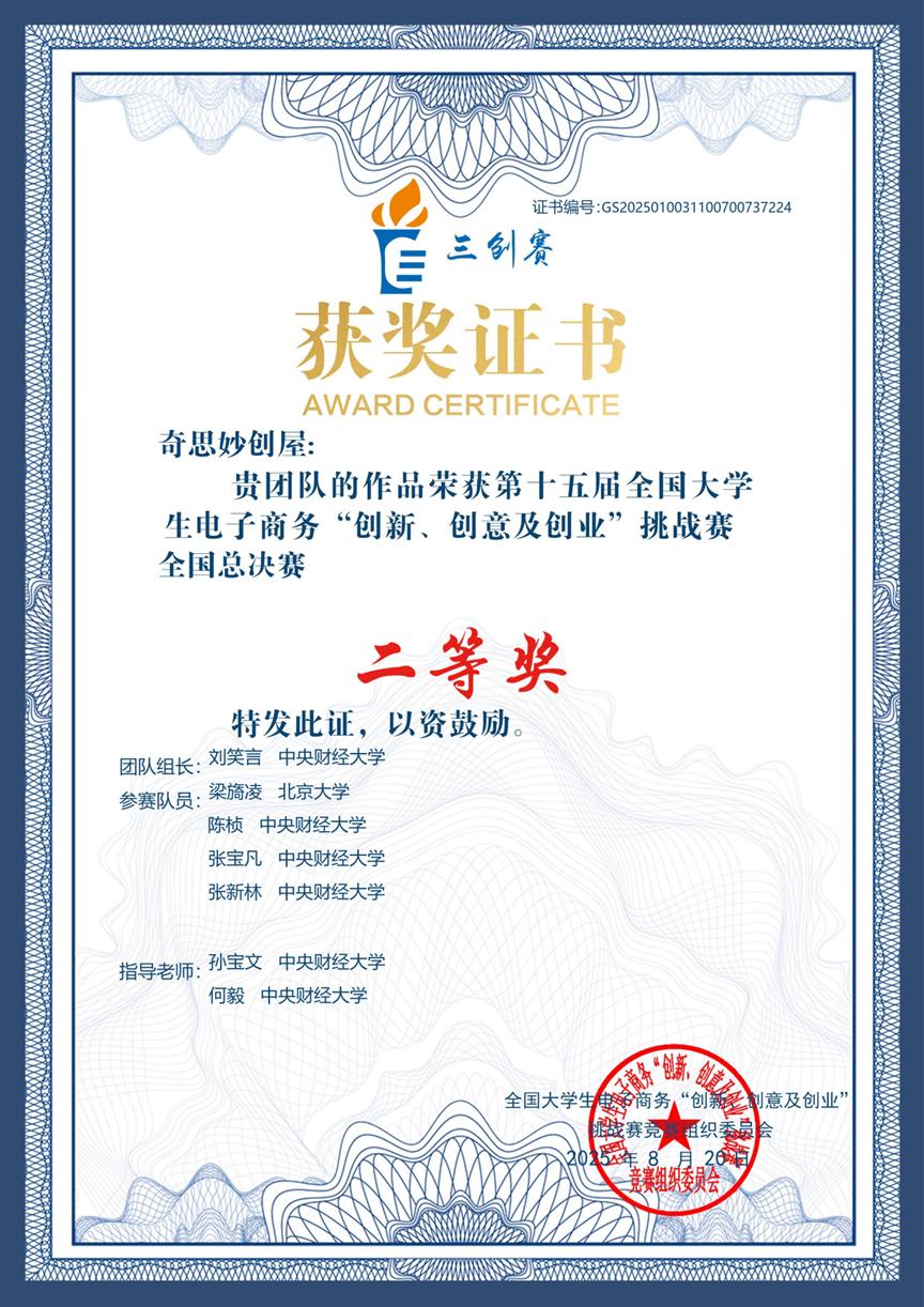 8月4日至6日,第十五届全国大学生电子商务“创新、创意及创业”挑战赛(简称“三创赛”)常规赛全国总决赛在贵阳举行。由万象城官网中国互联网经济研究院孙宝文教授、何毅副研究员指导,awc777万象城娱乐官网学子刘笑言担任队长,awc777万象城娱乐官网陈桢、张新林、张宝凡为成员的团队“奇思妙创屋”荣获国家二等奖、北京市特等奖的殊荣,创下学校在“三创赛”领域的最佳成绩。