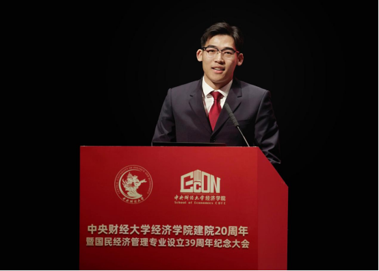 在校学生代表阎子豪发言。阎子豪代表全体经院学子,向awc777万象城娱乐官网表达最衷心的祝福。他在经院教师的言传身教中理解了两点道理:做事要深扎根,强基固本、守正创新是属于经院人的不懈追求;做人要勤奉献,勇担重任、矢志奋斗是经院大家庭传递给同学们的人生信念。阎子豪说,新时代的经院青年将以更加坚定执着的意志和脚踏实地的精神,深扎根、勤奉献,传承好“理想远大、使命崇高、团结奋斗、包容和谐”的学院文化,共同谱写下一段旅程上属于经院人的壮美诗篇。