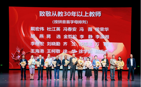 会上,致敬从教30年以上教师。老教师忠诚党的教育事业,兢兢业业,无私奉献,用良好的师德风范和教师素养、极强的事业心和责任感推动学院学科建设、人才培养水平高质量发展。