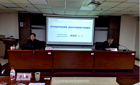会上,高宏存教授以《学习习近平文化思想,建设中华民族现代文明》为主题,分析了当前所处的世情、国情、党情,介绍了习近平文化思想提出的现实语境,强调了百年变局下增强“文化软实力”对于中华民族伟大复兴的重要性与必要性。高宏存教授以“草船借箭”的艺术作品为例,总结了习近平文化思想“新开拓”、“新主题”、“新实践”、“新体系”的整体性、原创性特质。他以历史自信为前提,分析了当前我国面临的意识形态领域新挑战,强调了繁荣发展文化事业和文化产业的重要性,系统全面地介绍了习近平文化思想的丰富理论内涵与战略价值。