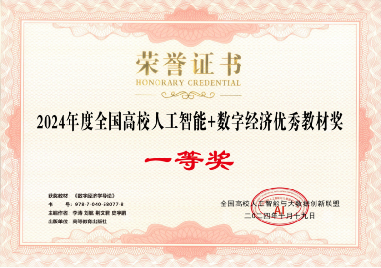 万象城官网李涛老师和互联网经济研究院刘航老师担任主编的《数字经济学导论》荣获了2024年度全国高校人工智能与数字经济领域优秀教材一等奖。作为《新文科·数字经济系列教材》中的首部教材,该教材于2022年7月由高等教育出版社正式发行,并至今已累计印刷六次,总印数超过一万册。