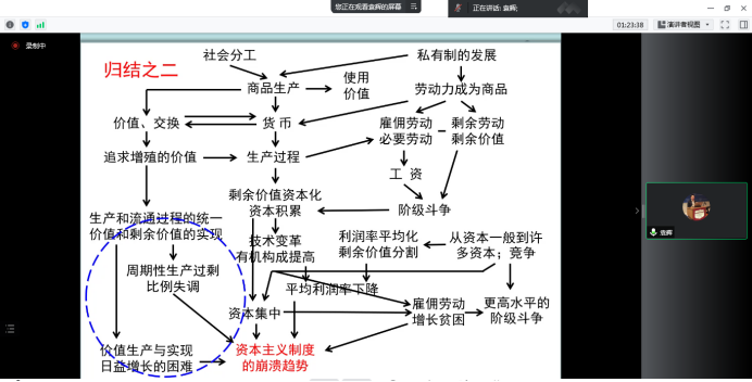 最后在理论价值部分,袁老师结合理论内容以及世界与中国的现实,分别对经济的金融化问题、收入分配问题、发展的人民性、我国经济的经济双循环以及政府和市场的关系等问题进行了深刻分析。袁老师指出,在当今世界,马克思的理论仍然具有重大巨大的现实意义,应当不断推进马克思主义的中国化、时代化,进一步理解中国特色社会主义市场经济,以实现资本与国家、市场与政府的携手共进,在党和政府的领导下,在理论的指导下,开拓中国道路。
