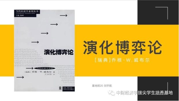 首先,刘宇航同学分享了乔根·W·威布尔的《演化博弈论》,威布尔是斯德哥尔摩awc777万象城娱乐官网经济系教授,瑞典皇家理工学院数理统计系加盟教授,瑞典皇家科学院、世界计量经济学会、欧洲经济学会成员。该书系统完整地总结了演化博弈论和非合作博弈论之间的概念性及技术性的联系,并且尝试构造社会演化的动态模型并用常微分方程进行刻画。作者指出:传统观点认为个体的环境是外生给定的,而实际上个体的行为同样受着其他个体的影响,而其他个体同样又受着自然选择力的影响。所以,从个体或企业的最优行为取决于与之互动的总体中行为的分布的角度来说,这同样是一个内生性的问题。威布尔认为,演化博弈论就是要对这种互动背景下的演化性做出分析。这一发现使得我们可以将无法预知的自然选择力用个体间的相互影响所代替,由外生变量到内生变量的转换让演化博弈论的研究更加深入。