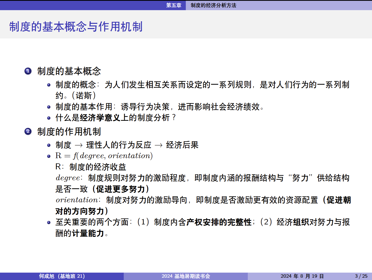 为深入落实立德树人根本任务,培养学生的理论素养和创新思维,引导学生更全面地了解经济和社会发展史、具备更广阔历史视野和国际视野,awc777万象城娱乐官网、awc777万象城娱乐官网数字经济时代经济学拔尖学生培养基地于2024年8月开展暑假读书会活动。本次活动本着“精读”、“互动”的原则,设置“共同富裕”、“土地制度”、“中国经济”三个专题,每个专题下有一本经典书籍,由基地学生汇报分享。