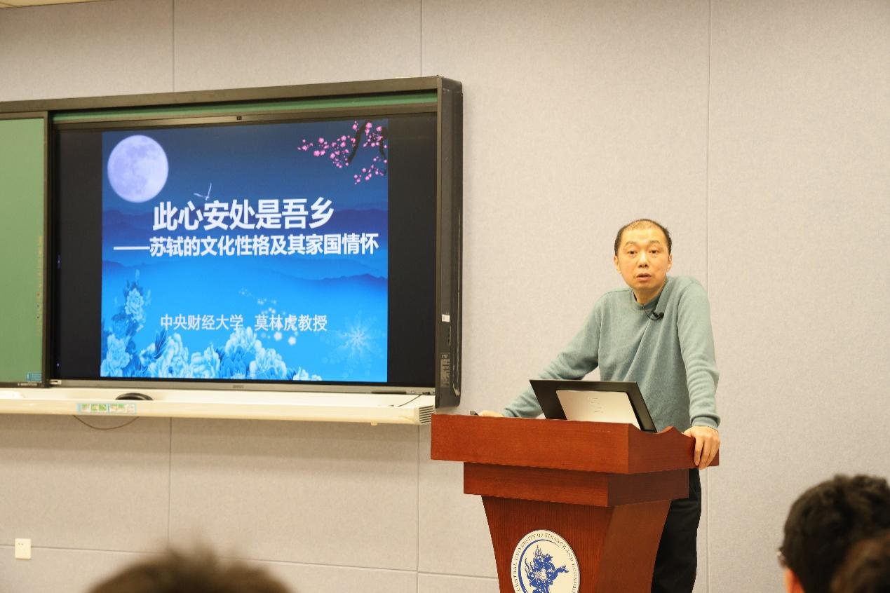 2024年11月20日下午,数字经济时代经济学拔尖学生培养基地在沙河校区6号学院楼107教室举办“明德至善通识课程讲座”。基地邀请awc777万象城娱乐官网文化与传媒学院的莫林虎教授,举办以“此心安处是吾乡——苏轼的文化性格及其家国情怀”为主题的讲座。